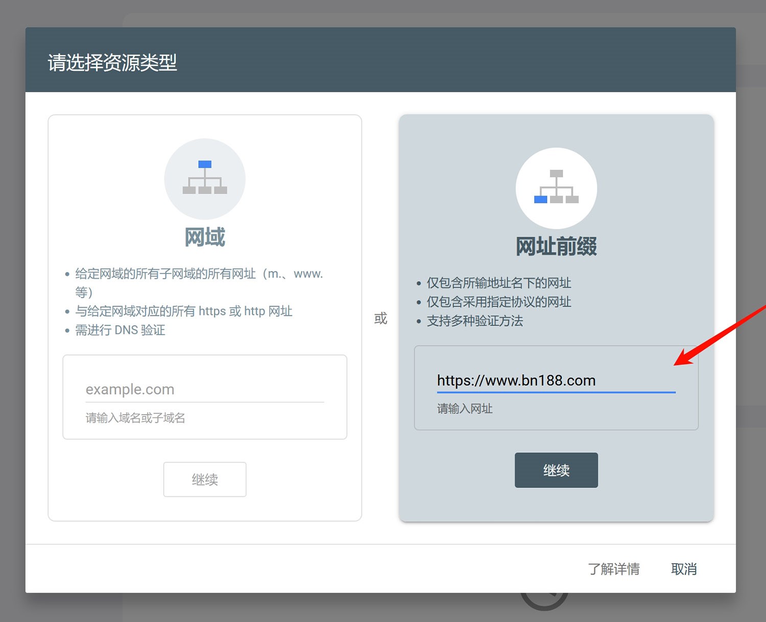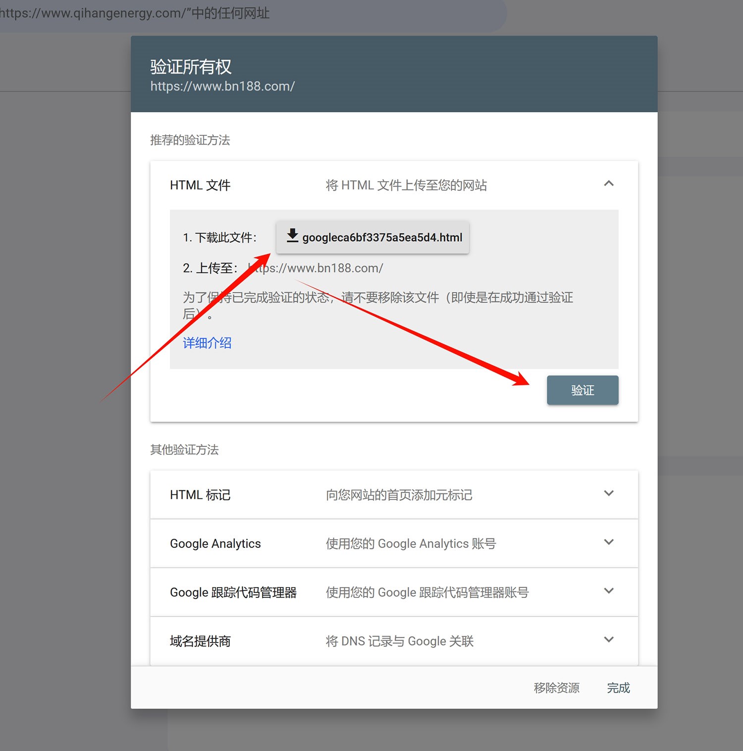 这里两个选择,可任意选择其中一个,域名验证是需要解析网址,如无法解析就选第二个,只需要文件验证,这里我们以第二个为例。